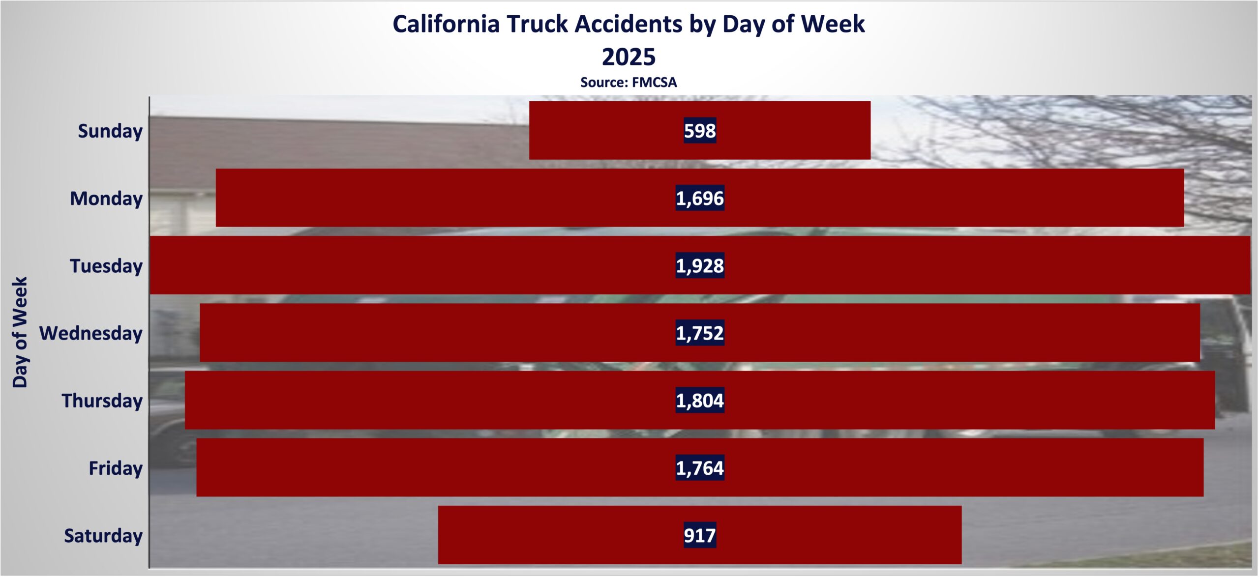 Looking at 2025 FMCSA data, truck accidents in California aren’t limited to certain days—they happen throughout the week: