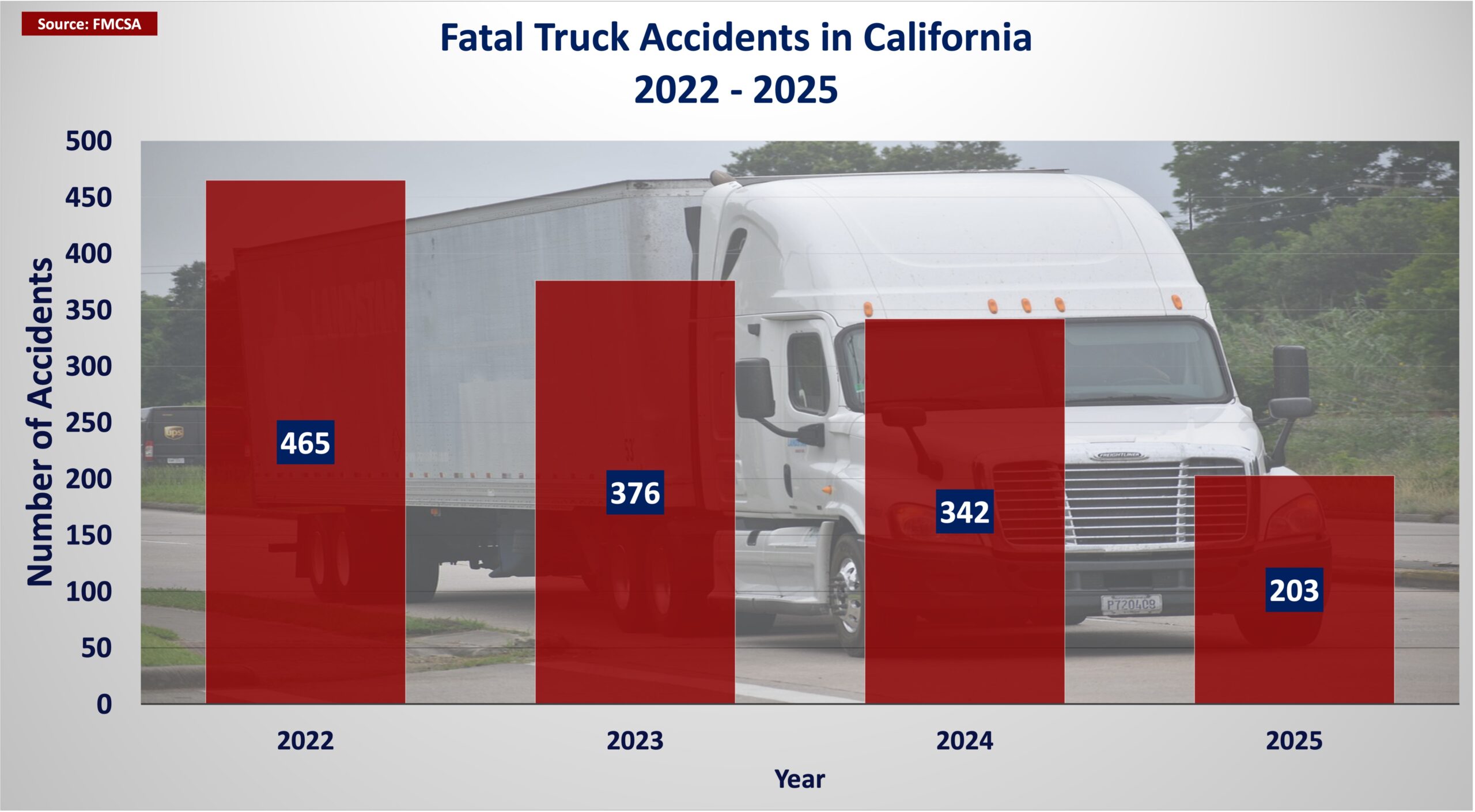 Living in California, you see semi-trucks on your commute everyday. Whether you live outside LA or are based in the Central Valley, semi-trucks are a part of life. One drawback of that is that it increases the likelihood of an accident. According to data from the Federal Motor Carrier Safety Administration (FMCSA), California has seen: